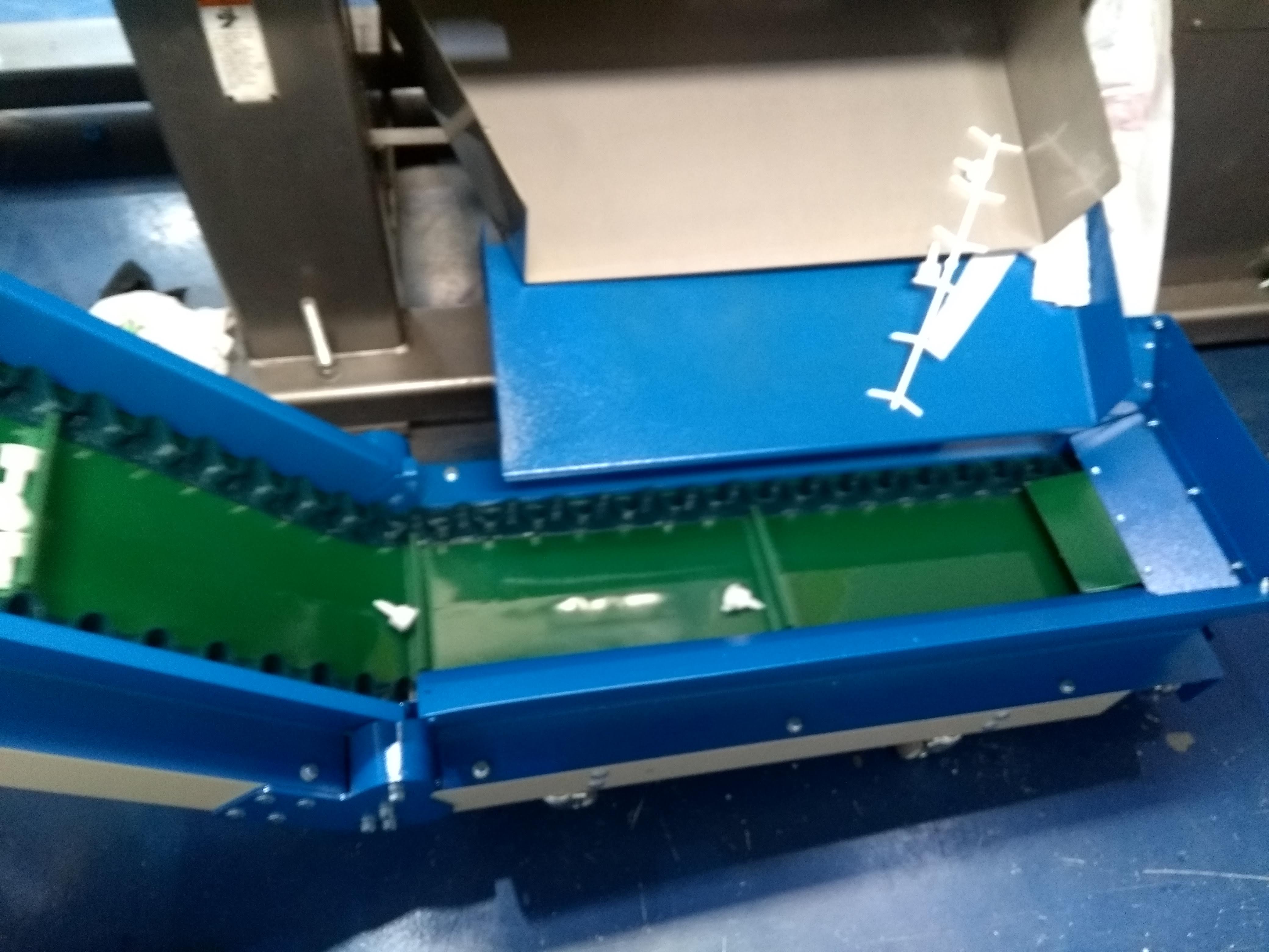 Esteira transportadoraEste equipamento funciona em dois estágios, coletando peças diretamente na saída das máquinas e as levando até um patamar elevado, seja para arma
